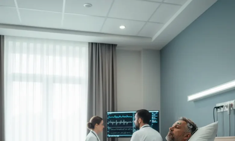2. دراسة النوم (Polysomnography – PSG): هذا هو المعيار الذهبي للتشخيص. يتم إجراء هذا الاختبار عادة في مختبر للنوم، حيث يتم توصيلك بأجهزة استشعار تراقب: