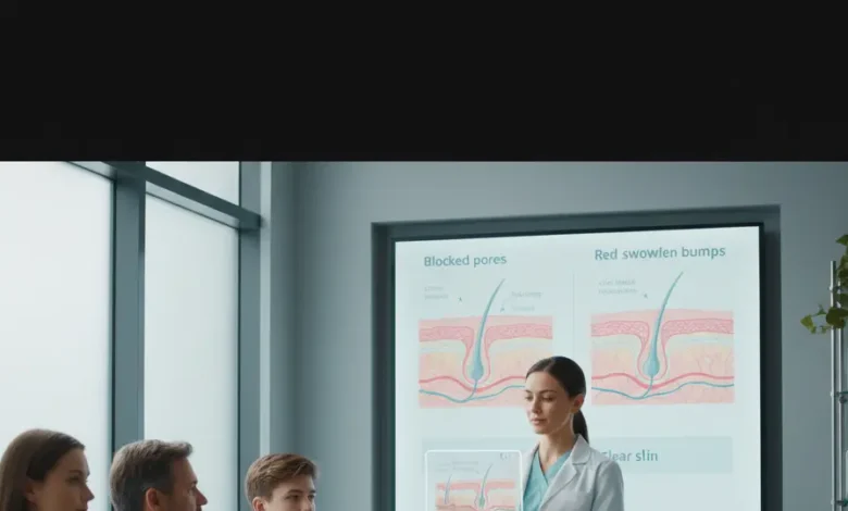 - الانسداد: تبدأ المشكلة عندما يحدث خلل. قد تفرز الغدة كمية زائدة من الزهم (بسبب التغيرات الهرمونية مثلاً)، وفي نفس الوقت، لا تتساقط خلايا الجلد الميتة بشكل صحيح فتتراكم عند فتحة المسام. هذا الخليط من الزهم الزائد وخلايا الجلد الميتة يشكل “سدادة” (Microcomedone) تغلق المسام.